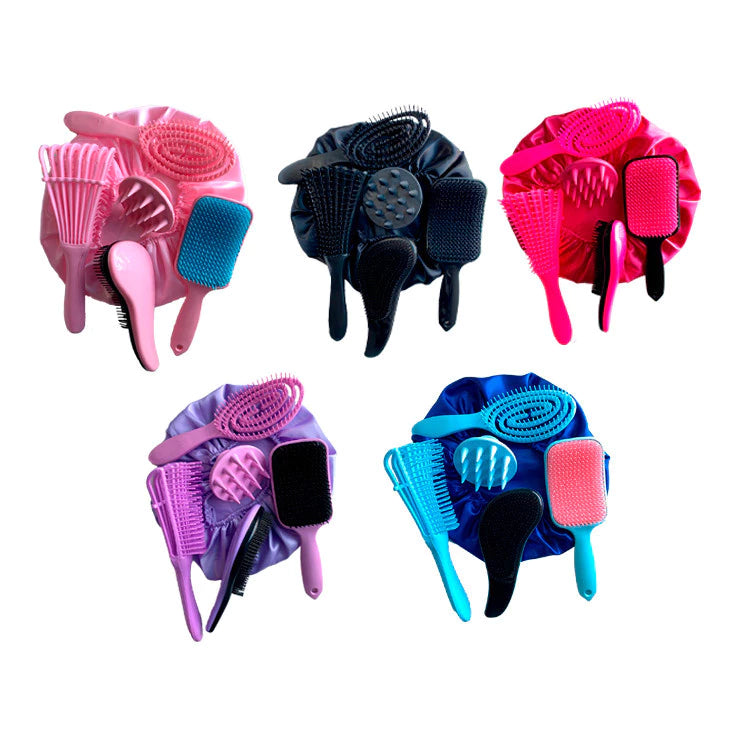 Cuide dos seus fios de forma prática e profissional com este kit exclusivo, que reúne cinco escovas essenciais e uma touca de cetim antifrizz, oferecendo tudo o que você precisa para desembaraçar, modelar, massagear e proteger os cabelos.